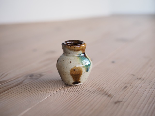 キマノ陶器さんの ころんと手のひらに包まれるようなようじ壺です。 のどかで優しい趣があり小さな野の花を入れて楽しまれても。 _____ 沖縄県の読谷村にて陶芸を学んだ後、栃木県益子町にてご夫婦で作陶。 沖縄の伝統的な技法を益子の土と釉薬で表現されています。 高さ 約5.5cm 横 約5cm 口直径 約3cm
