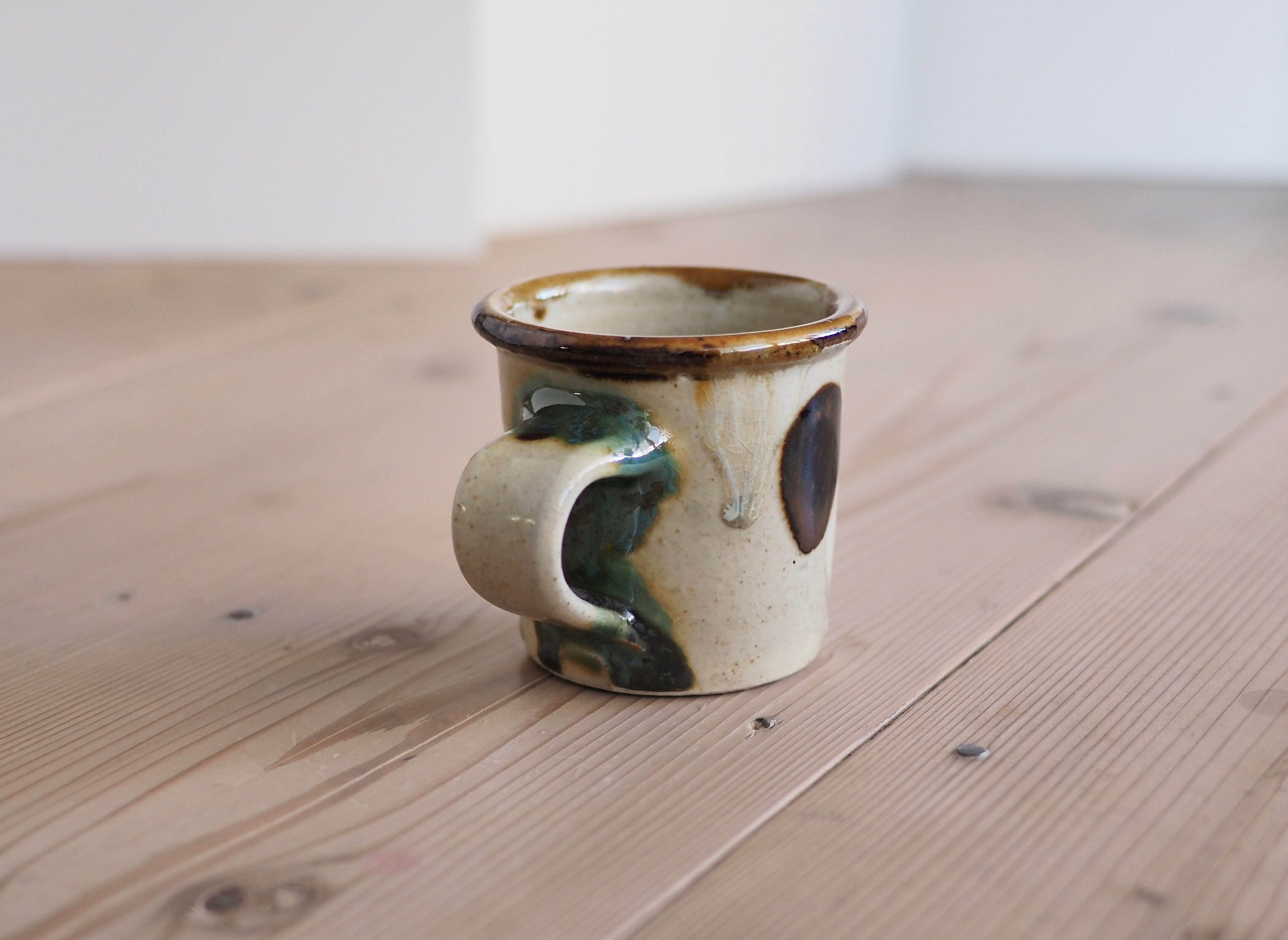 筒型でぽってりとした釉薬がかかったマグカップです。