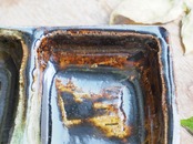 三色の釉薬が同居する薬味入れ。